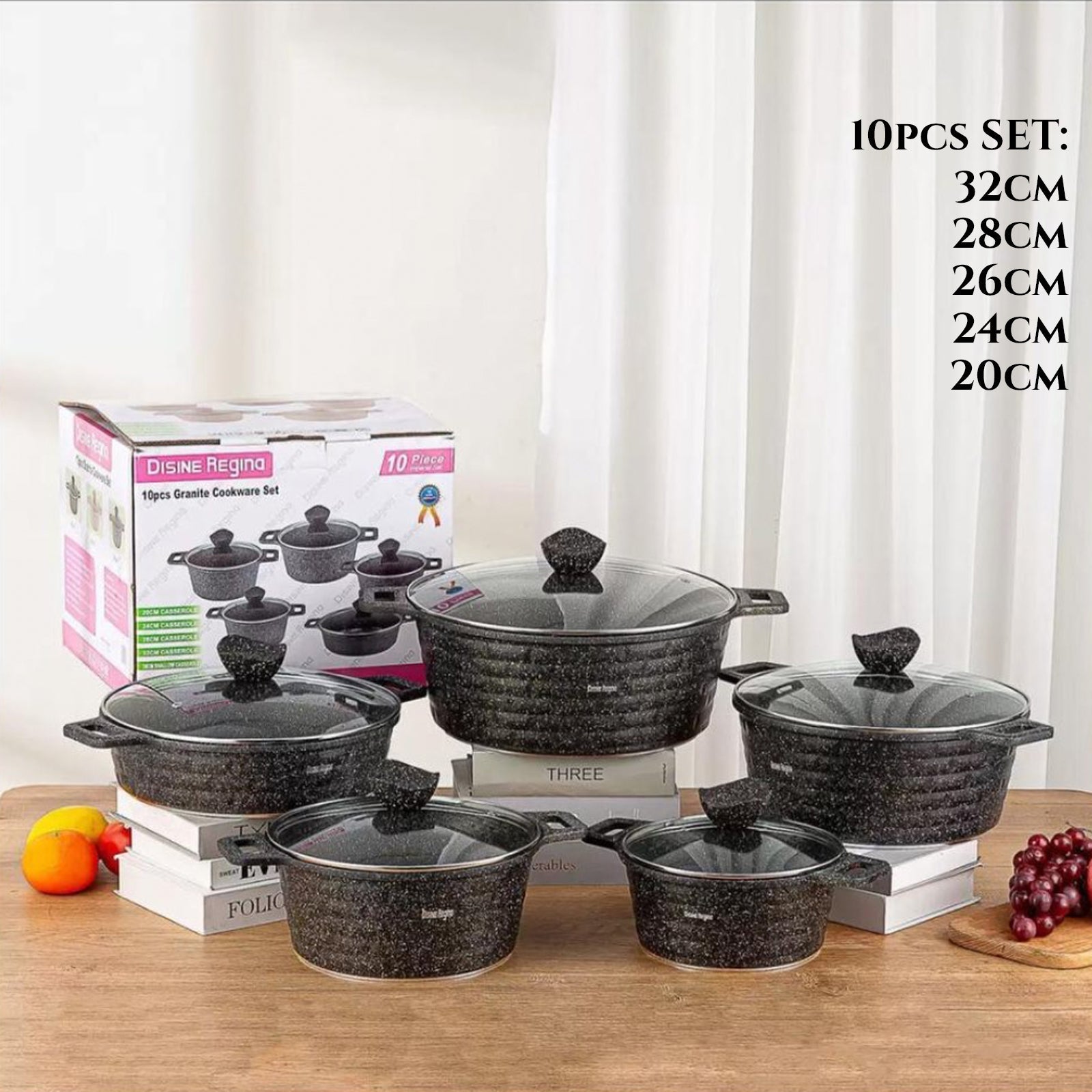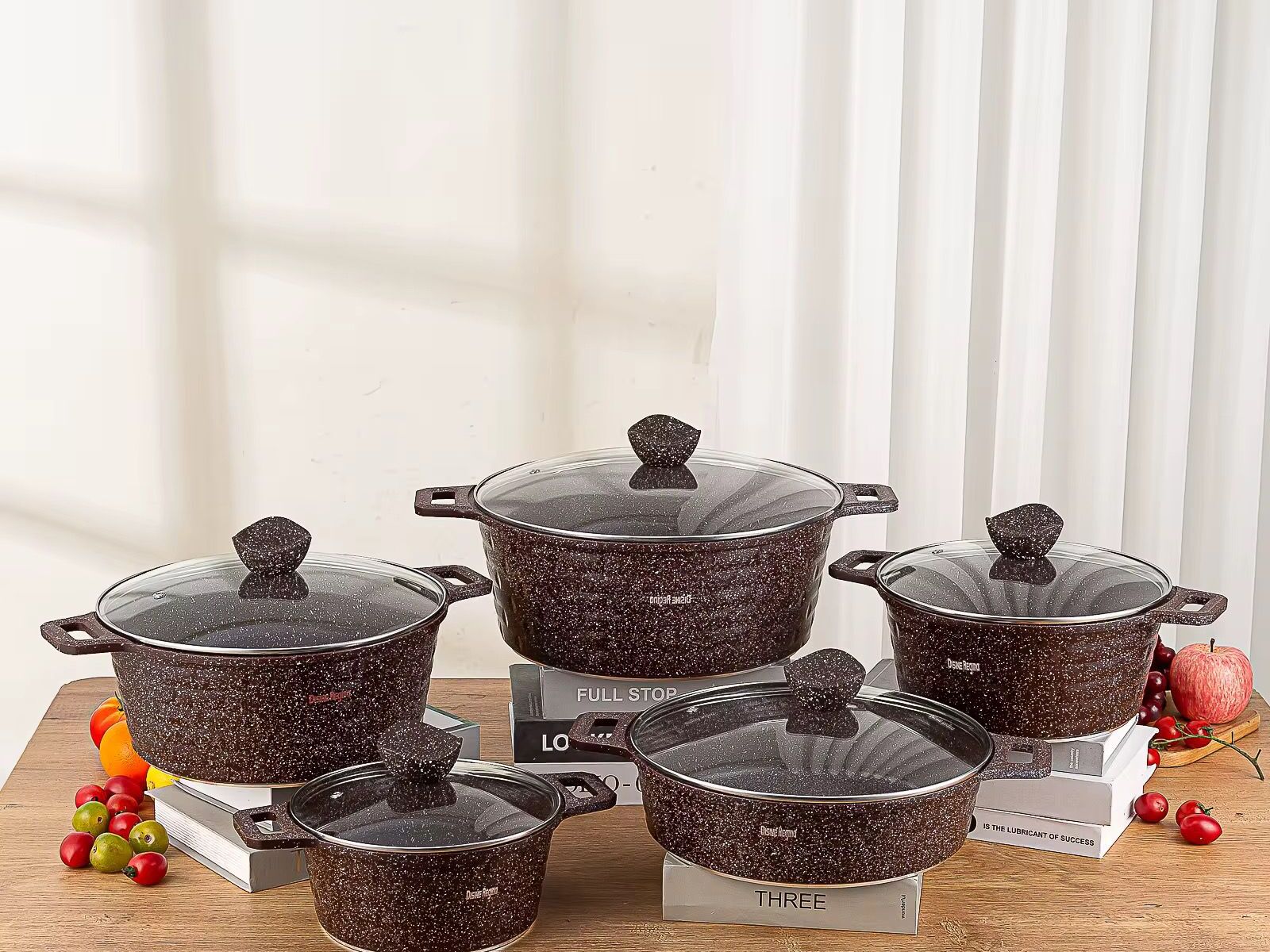 Eleganten in praktičen set loncev, ki vsebuje vse potrebno za vsakodnevno kuhanje. Moderen granitni videz, več različnih velikosti in stekleni pokrovi naredijo ta set idealno izbiro za vsako kuhinjo.