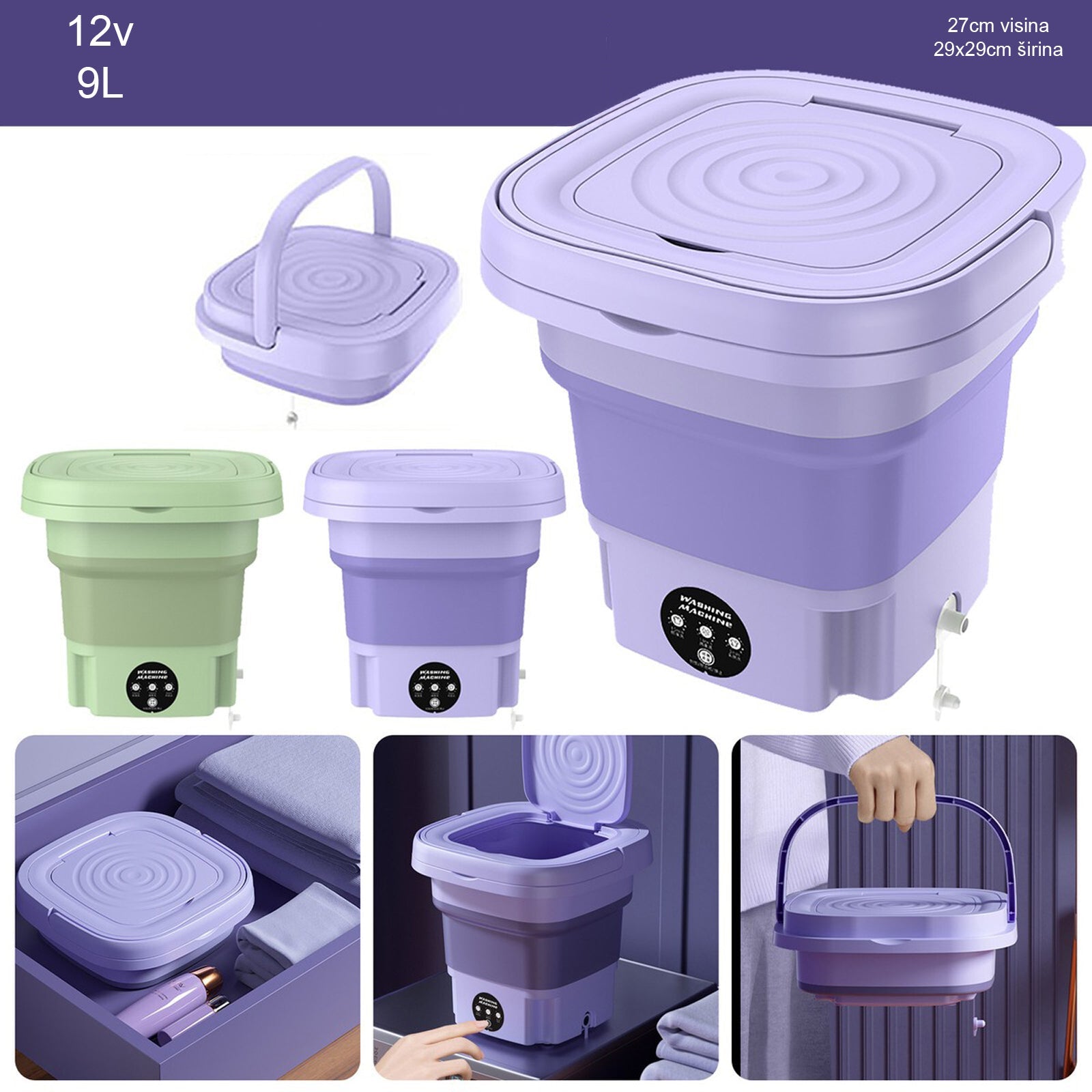 Praktičen in kompakten mini pralni stroj, idealen za hitro pranje manjših količin perila. Zložljiv dizajn omogoča enostavno shranjevanje, prenosna izvedba pa je popolna rešitev za stanovanja, študentske sobe, kampiranje ali potovanja.