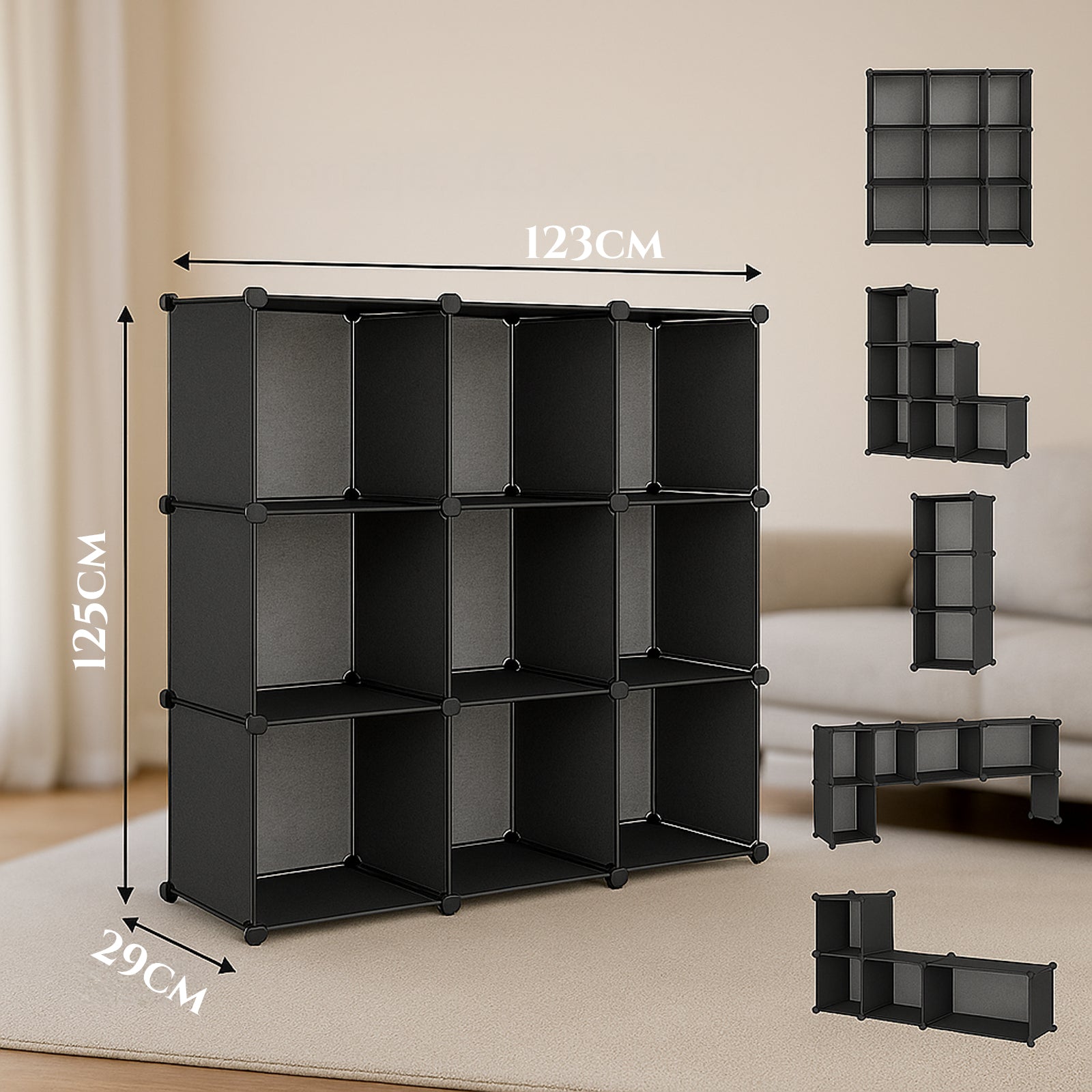 Ta večnamenska polica z 9 kvadratnimi predali prinaša popolno ravnovesje med praktičnostjo, organizacijo in modernim videzom. Zasnovana za dnevno sobo, spalnico, hodnik ali pisarno, je idealna za shranjevanje knjig, čevljev, oblačil, igrač in dekoracije. Zahvaljujoč modularni konstrukciji jo je enostavno prilagoditi vašemu prostoru, njen minimalističen dizajn pa se bo ujel z vsakim interierjem.