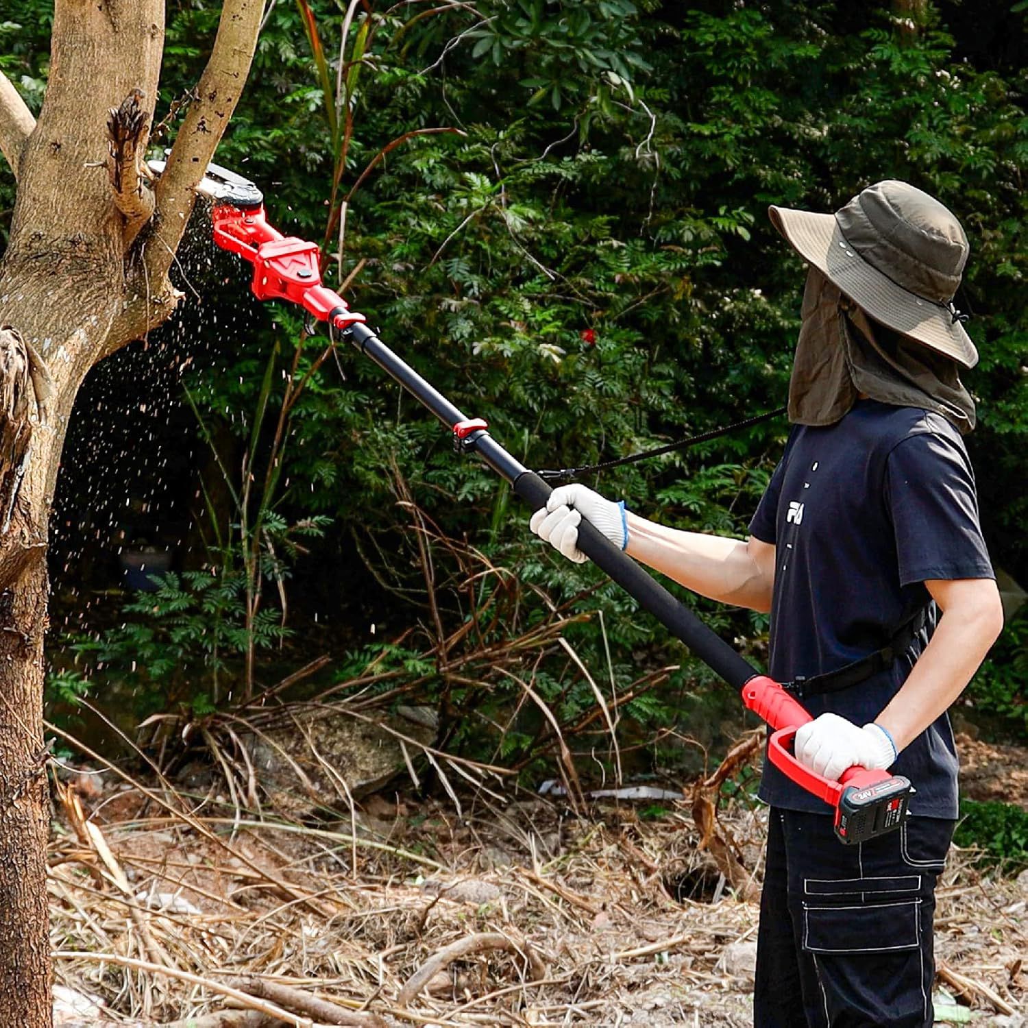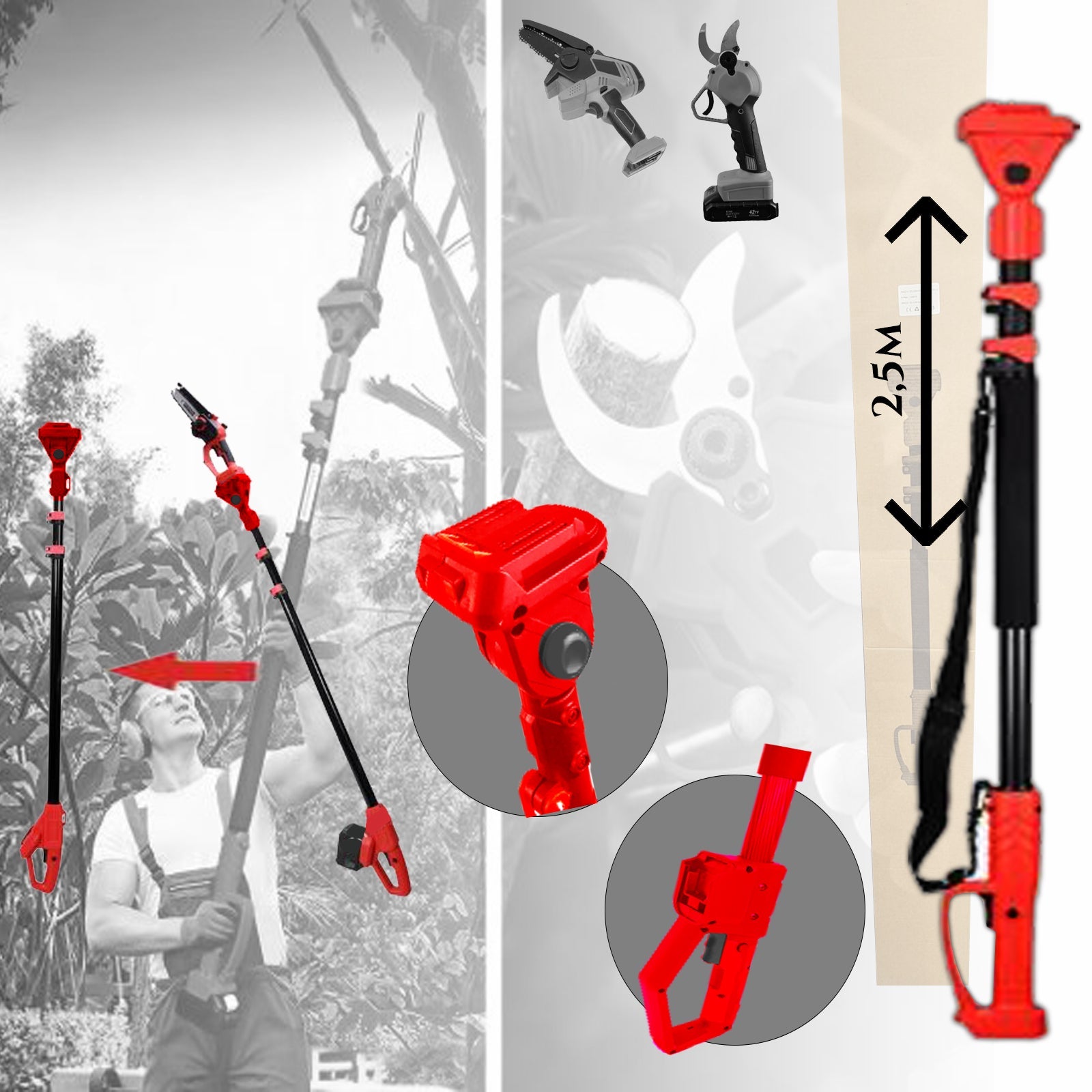 Teleskopska akumulatorska žaga je zasnovana s funkcijo teleskopskega podaljševanja, ki omogoča enostavno nastavitev dolžine do 2,5 metra, kar vam omogoča, da z lahkoto dosežete visoke veje in vrhove dreves. Ne glede na to, kako visoke ali težko dostopne so, ta žaga omogoča hitro in natančno rezanje, kar bo pospešilo vaše vrtnarsko delo. Zahvaljujoč akumulatorski tehnologiji žaga deluje brez kabla, kar omogoča večjo mobilnost in svobodo gibanja. Njen močan motor in ostra rezila zagotavljajo brezhibno učinkovitost in vzdržljivost, hkrati pa vam omogočajo delo z minimalnim naporom.💪🔋